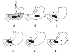 Figure 2 Represents expandable drug delivery system. A) The device significantly swells on contact with gastric fluids (to a few hundred times of the original volume); B – D) the gastric contraction pushes the hydrogel to the pylorus; E) the gastric contraction slips over the surface of the hydrogel; and F) the hydrogel is pushed back into the body of the stomach.
