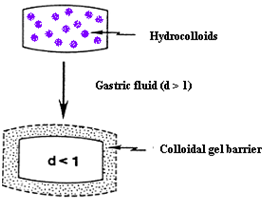 Such a system contains drug with gel-forming hydrocolloids meant to remain buoyant on the stomach content. This system incorporates a high level of one or more gel-forming highly soluble cellulose type hydrocolloid, e.g., hydroxypropyl cellulose, hydoxyethyl cellulose, hydroxypropyl methyl cellulose (HPMC), polysaccharides and matrix-forming polymer such as polycarbophil, polyacrylate and polystyrene. On coming in contact with gastric fluid, the hydrocolloid in the system hydrates and forms a colloid gel barrier around its surface. The schematic diagram of colloidal gel barrier system is shown in Figure 3.