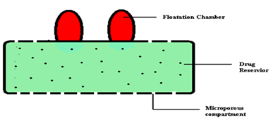 This technology is based on the encapsulation of a drug reservoir inside a microporous compartment with pores along its top and bottom walls (Figure 4). In the stomach, the floatation chamber containing entrapped air causes the delivery system to float over the gastric content. Gastric fluid enters through the aperture, dissolves the drug and carries the dissolved drug for continuous transport across the intestine for absorption.