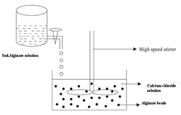 Multi-unit floating dosage forms have been developed from dried calcium alginate complex.15 Spherical beads of approximately 2.5mm in diameter can be prepared by dropping sodium alginate solution into aqueous solution of calcium chloride, causing the precipitation of calcium alginate. The beads are then separated, snap-frozen in liquid nitrogen, and freeze-dried at -40ºC for 24 hours, leading to the formation of a porous system, which can maintain a floating force for over 12 hours. Schematic diagram for preparation of alginate beads is shown in Figure 5.