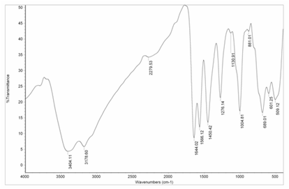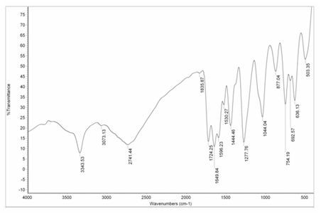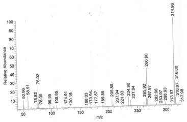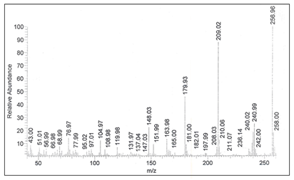 Identification of the degradation product: Infra red (IR) spectrum of the degradation product showed abroad peak at 3404cm-1 which may be assigned to the primary amine group, also disappearance of the peaks at 2741cm-1 of the methyl group and at 1724cm-1 of the carbonyl group, (Figure 2 & Figure 3). Mass spectrometry showed that the compound has a molar mass of 256.96 indicating the presence of the degradation product, (Figure 4 & Figure 5).