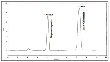 Chromatographic conditions: Several trials were applied to develop the optimum chromatographic conditions for the sufficient separation of oxfendazole and its degradation product.