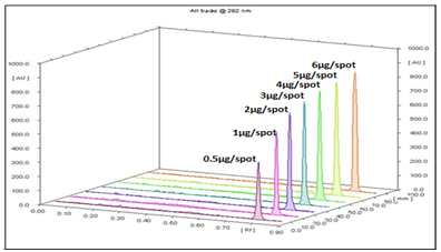 Figure 8 3D TLC- densitometric chromatogram of oxfendazole (0.5-5.5µg/spot) and its degradation product (5.5-0.5µg/spot) at 292nm.