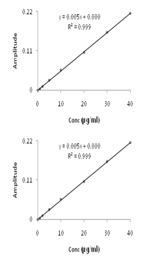 Linearity: 1-60µg/ml Timolol maleate and 1-40µg/ml Brimonidine tartrate solutions were prepared from the stock solutions separately and scanned against the reagent blank i.e. borate buffer pH 9.0 and the first derivative is done with the help of inbuilt software and the absorbance values were calculated at the selected wavelengths for both the methods. A graph was drawn by taking the concentration of the drug solution on the x-axis and the corresponding absorbance values on the y-axis at the selected wavelengths.