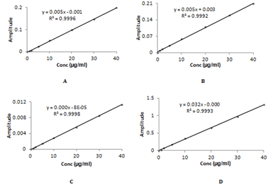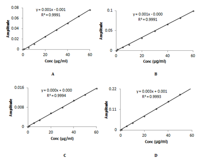 The overlay ratio derivative spectra of Timolol maleate and Brimonidine tartrate was shown in Figure 3 & 4. In Figure 3A-3C TML is added, subtracted and multiplied with 10µg/ml of BRM whereas in Figure 3D TML is divised with 40µg/ml of BRM. Linearity was observed over the concentration range 1-60µg/mL and 1-40µg/mL for TML and BRM for each method respectively. The linear regression equations of Timolol maleate were found to be y=0.0013x - 0.0013 (R2=0.9991), y = 0.0016x-0.0002 (R2=0.9991), y=0.0003x+0.0002 (R2=0.9994) and y=0.0037x+0.001 (R2=0.9994) in method A, B, C and D respectively. The linear regression equations of Brimonidine tartrate were found to be y=0.005x-0.0015 (R2=0.9996), y=0.0052x+0.0038 (R2=0.9992), y=0.0003x–0.0005 (R2=0.9998) and y=0.0327x-0.0004 (R2=0.9993) in method A, B, C and D respectively. A graph was drawn by taking the drug concentration (TML or BRM) on the x-axis and the corresponding derivative absorbance on the y-axis and a straight line graph was obtained (Figure 5A-5D & 6A-6D).