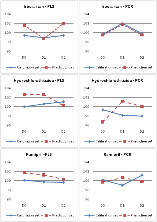 PLS, partial least squares; PCR, principal component regression; IRB, irbesartan; HCZ, hydrochlorothiazide; RAM, ramipril; HPLC, high performance liquid chromatography; PLS, partial least squares regression; SEP, standard error prediction
