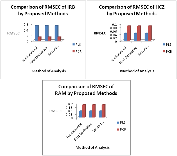 Figure 3 Comparison of Root Mean Square Error of Calibration (RMSEC) of PLS and PCR models for Fundamental (D0), First Derivative (D1) and Second Derivative (D2) Spectra.
