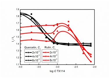 The intensity ratio I1 /I3 of the first (372nm) and the third (384nm) vibronic peaks of the pyrene fluorescence spectrum is related to the micropolarity of the microenvironment in which pyrene is solubilized. Therefore its variation shows a change in the hydrophobic environment with respect to composition. As follows from Figure 1 as the total concentration of TX114 increases, the I1 /I3 values display an abrupt drop to the relative stabilization at C higher than 10-3M only in the case of quercetin solutions. This abrupt sigmoid decrease in I1 /I3 clearly indicates that the aggregation of TX114 was formed, and pyrene preferentially resides in a more hydrophobic microenvironment of the aggregates. In the case of rutin solutions the I1 /I3 values decrease at C higher than 10-3M. At smaller concentration of surfactant the higher the rutin concentration the lower the values of the I1 /I3 ratio. This means that the interactions of quercetin and rutin with the micelles of the studied nonionic surfactant are quite different and as a result, also the location of fluorescence probe in the mixture changes.