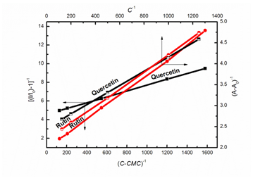 This fact is confirmed by the values of the binding constant, K, of the quercetin/rutin-surfactant system for C1 =2x10-5M calculated on the basis of the Uv-vis spectra and the relation between (A-A0 )-1 and C-1 (Figure 2).3 These values of K are equal to 1.46x103 and 0.11x103 for quercetin and rutin, respectively, and are very close to those obtained on the basis of the fluorescence emission spectra of quercetin and rutin and the relation between (I/I0 -1)-1 vs. (C-CMC)-1.4 where CMC is the critical micelle concentration of TX114.5