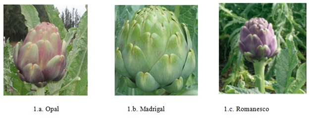 The work was carried out with globe artichoke heads harvested during September and October of 2017 in the area of Rosario (33° LS, 60° 59W, Argentina). Three cultivars were used (Figure 1): the hybrids Opal (1.a) and Madrigal (1.b), both from the Nunhems Company, and the Romanesco, also known as French variety (1.c), produced using asexual reproduction, being the most traditional farming material in the area.