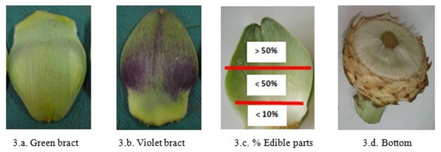 The color of the bracts was established by differentiating between green (Figure 3a) and violet (Figure 3b) and the percentage of parts that are edible was evaluated according to Figure 3c. The presence of "hairs or thorns", presented by the very developed flowers and that appear when the heads are overripe, was identified as shown in Figure 3d.11