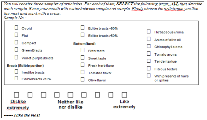 Given the greater varietal supply of the globe artichoke and evaluating its use for human consumption, it is important to carry out market positioning work, including the recognition of the newly available cultivars. The innovative sensorial Check all that apply (CATA) technique have sprung up in search of a direct link with consumers. The CATA methodology consists in statements used by consumers to mark out as many options as are needed to express their opinion about the product under analysis. Such methodology is descriptive, not lengthy, flexible and can be apply on the consumers without the need for trained appraisers.8