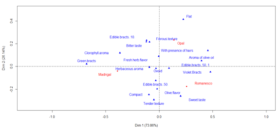 The first dimension (Dim 1) explains 73.86% of the differences found between the globe artichokes. The most distinguishing elements are the color, “green” for Madrigal and “violet” for Romanesco and Opal, and the “Clorophyl aroma” or the “Aroma of olive oil”, respectively. The "presence of hairs" is a descriptor close to the Romanesco and Opal artichokes, indicating that the Madrigal artichoke does not have this characteristic.
