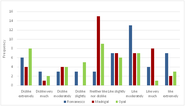 Figure 6 Frequencies of preference of the consumers for the different cultivars Romanesco, Madrigal y Opal.