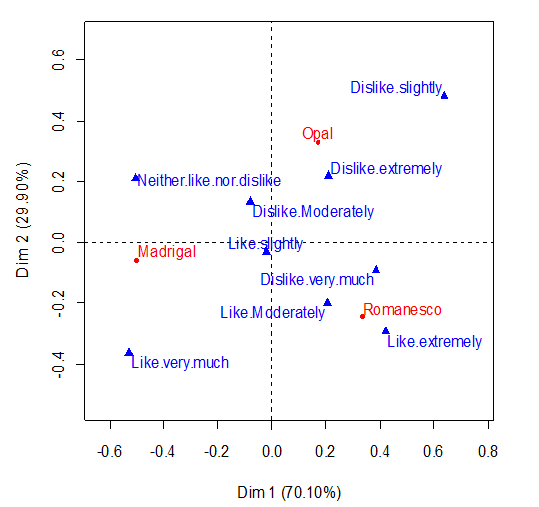 Figure 7 Correspondence Analysis on the preference of the consumers for the different cultivars Romanesco, Madrigal y Opal.