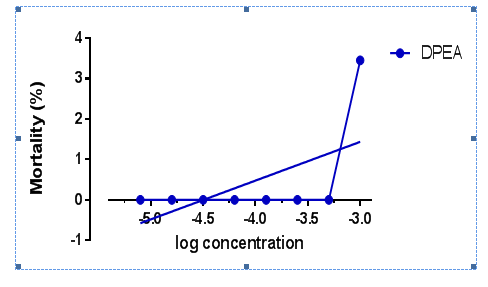 0.25g of brine shrimp eggs (nauplii) were hatched in a well aerated beaker containing 3.8% of 250mL seawater (sea salt in distilled water). Then, it is left at room temperature for 24 to 48hours with bright light for the hatching process. Later, 0.2g of DPEA extract was dissolved in 100mL of distilled water to make 2000ppm concentration of stock solution. Serial dilution will be carried out using the stock solution to prepare working extract solution with 1000ppm, 500ppm, 250ppm, 125ppm, 62.5ppm, 31.2ppm, 15.6ppm and 7.8ppm concentration. After the hatching process completed, 5mL of each extract solution and 5ml of seawater containing 10 brine shrimp eggs were treated and incubated in petri dish. The petri dishes were left for 24 hour at room temperature with well aerated condition and bright light source. Each of the petri dish was examined after 24hours by using magnifying glass and the average number of survived nauplii was counted. The control for this assay is 10mL of seawater containing 10 brine shrimp eggs. The percentage (%) of mortality of the brine shrimp nauplii was calculated using the following formula:
