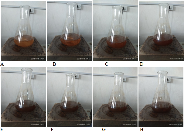 Figure 1(A-H) Colour transformation of mixed C. reflexa and silver nitrate solution with increasing time period and temperature.