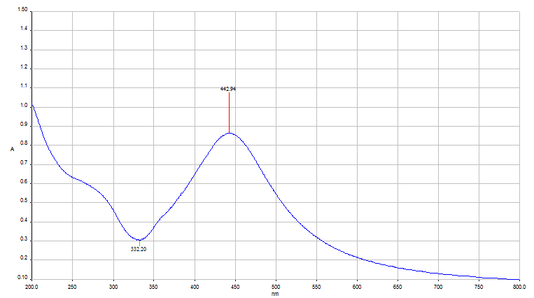 UV-vis spectroscopy is one of the most commonly used technique for the characterization, stability, morphology, shape, size, and chemical surroundings of synthesized nanoparticles and it provides surface plasmon resonance (SPR) band due to the combined oscillation of electrons on valence band and conduction band on the surface of AgNPs.17,18 In previous study UV-vis spectroscopy of Costus pictus extract mediated nanoparticles provided adsorption peak at 420nm.19 Previously UV-vis analysis of C. mathewii extract mediated water suspended AgNPs studied and reported a peak of absorption at 423nm that suggested the presence of AgNPs due to surface plasmon resonance.20 The absorption spectrum of nanoparticles obtained from UV-visible absorption spectroscopy is presented in Figure 2, which shows peak at 442.94nm corresponds to the SPR and correlate with the respective UV-Vis spectra of the colloidal solution SNPs of previous studies.