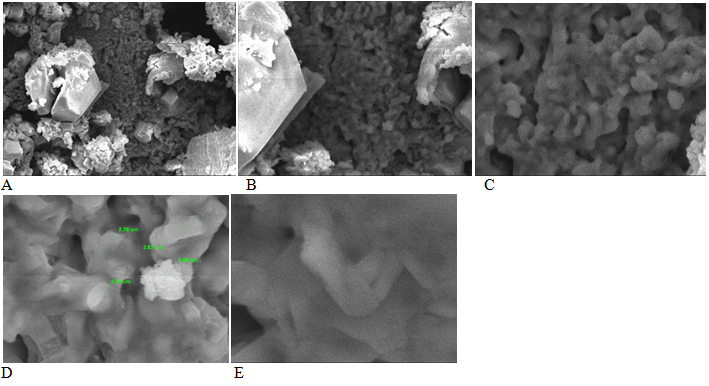 Figure 3 SEM photographs of C. reflexa extract mediated silver nanoparticles (A: 1000X, B: 2500X, C: 5000X, D: 10000X, E: 20000X).