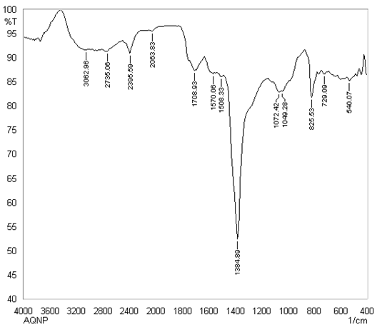 FTIR analysis deals with the probable mechanism behind the formation of SNPs and provides the information about functional groups present on the surface on SNPs.12,26 Result of infrared spectrum analysis of C. reflexa is presented in Figure 6. The result reveled absorption peaks 3062.96cm-1 represented to O-H stretch for alcohol and phenol, 2735.06cm-1, 2395.59cm-1, 2063.83cm-1 represented to N-H stretches for primary and secondary amines, 1708.93cm-1 represented to C=O for conjugated aldehydes and acids, 1570.06cm-1 and 1508.33cm-1 represented to C=C stretches for aromatic compounds, 1384.89cm-1 represented to NO2 and S=O stretches for sulphonyle chloride and sulphonamides, 1072.42cm-1 and 1049.28cm-1 represented to C-N stretch for amines, 825.53cm-1 for C-H stretch represented to vinyl group and 729.09cm-1 and 540.07cm-1 for halo alkans (Figure 8).27-29