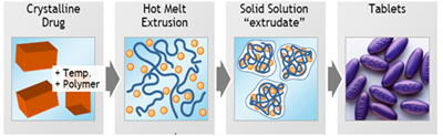 Figure 2 illustrates the HME process in which a polymer when heated, typically at approx. 50°C above its glass transition temperature (Tg), melts and acts as a solvent, dissolving the crystalline API. The entire process (melting of polymer and dissolving of API) takes about 2 minutes or less, and the crystalline drug is fully converted to an amorphous dispersion or solid solution.16 Increasing amounts of drugs could lead to precipitation and phase separation in the polymeric matrix, which is basically characterized by the melting temperature of API and the individual Tgs of drug and polymer. The glassy extrudate with drug molecules completely dissolved in the polymer can be further processed into tablets or cut into desired pellets.