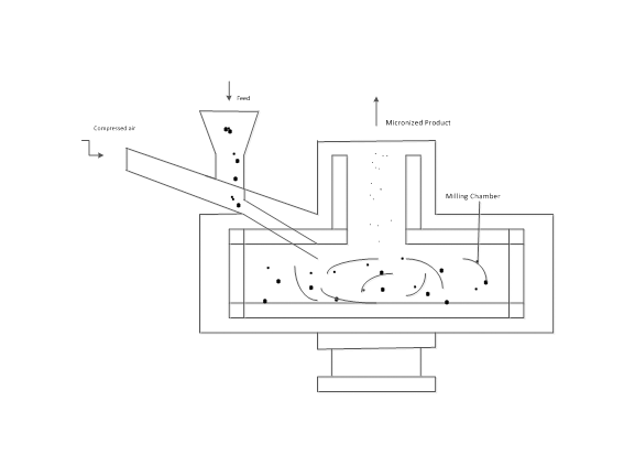 Micronization of drugs is done by milling techniques using Jet mill, Ball mill, Rotor-stator colloid mill, etc. This approach can reduce particle sizes down to 1 micron. Micronization improved the digestive absorption, and consequently the bioavailability and clinical efficacy of griseofulvin, progesterone, spironolactone and diosmin,9 Figure 1 presents the schematic presentation of Jet mill, which is commonly used for micronization.