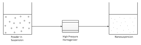 Media milling and high pressure homogenization are the commonly used methods for the preparation of nanosuspensions. Nanosuspension can be converted in to dry powder by freeze drying or spray drying and then compressed in to a tablet or encapsulated in to a capsule. The liquid nanosuspension can also be sprayed on to sugar spheres to make drug layered pellets. Figure 2 shows the diagrammatic presentation of preparation of nanosuspension by high pressure homogenizer.