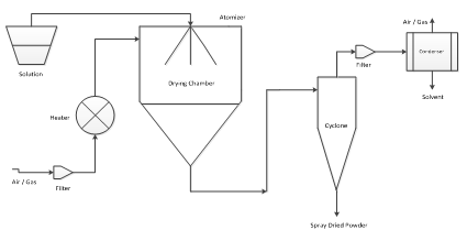 In spray drying process, a poorly soluble drug and a suitable polymer is dissolved in a solvent such as acetone, ethyl alcohol or isopropyl alcohol. The drug-polymer solution is pumped to an atomizer inside the drying chamber of a spray drier. The solution is converted in to small droplets by the atomizer. The small droplets are rapidly converted to fine particles by the hot drying gas such as nitrogen. The dried powder is generally collected from the gas stream using a cyclone or filter system. Spray dried intermediate can be blended with a few other ingredients (e.g., diluent/glidant/lubricant) and can be compressed in to a tablet or encapsulated in to a capsule. Figure 3 illustrates the spray drying process.