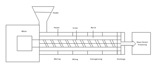 Hot melt extruder consists of a feeding hopper, barrel, single or twin screw system, screw driving unit, and a heating or cooling device. Typical readouts include melt pressure, melt temperature, and motor amperage. Twin screw extruders utilize segmented screws that are assembled on high torque shafts. Barrels are also modular and integrate internal bores for cooling. Segmented screws/barrels, in combination with the controlled pumping and wiping characteristics of the co-rotating, self-wiping screws, allows screw/barrel geometries to be matched to the process tasks. Some of the process parameters to be controlled are screw speed, feed rate, temperature along the barrel and die, and vacuum level. Figure 4 presents the schematic diagram of hot melt extruder.
