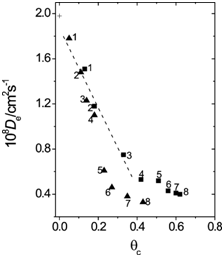 A reduction of the POAP electroactivity was observed after its interaction with ferric cations (Figure 1). The reduction of the POAP electroactivity was attributed to the interaction of iron ions with the redox sites of POAP, which impedes the protonation reaction of the polymer. Here, only some transport parameters vs. degree of deactivation dependences, will be shown. The metal-film resitance, Rm|f exhibits an almost continuous increase from the beginning of the deactivation, that is, from qc = 0 to qc = 0.6 (Figure 2). This increase is consistent with an increasing number of inactive sites at the metal polymer interface, as the deactivation becomes more pronounced. The ion film-solution resistance, Rif|s as a function of qc (Figure 3) exhibits a different feature as compared with Rm|f. That is, while a strong Rif|s increase is observed within the range 0 < qc < 0.35, a less pronounced increase is obtained at values of qc > 0.4. When deactivated POAP films are reactivated by alkaline treatment, all dependences (Cp, Rm|f, Ref|s, Rif|s and CH vs. qc) exhibit a univocal correspondence between deactivation and subsequent reactivation (Figure 2 & 3). However, this is not the case for the dependences that involve diffusion coefficients for electron (De) and ion (Di) transport. These dependences are shown in Figure 4 & 5, respectively. Diffusion coefficients for electron and ion transport decrease as the degree of deactivation (qc) increases. Both dependences exhibit a univocal correspondence during deactivation and subsequent reactivation, for degrees of deactivation lower than 0.4. Slower electron transport with the increase of the degree of deactivation was attributed to the increase of the electron hopping distance caused by the presence of inactive sites in the redox site configuration of a deactivated film. Decrease of the ion diffusion coefficient with the increase of the degree of deactivation up to 0.4 was associated with the inhibition of nitrogen-containing groups that provide the binding of hydrogen ions that contribute to film conductivity. Both dependences show a change of slope for degrees of deactivation higher than 0.5 together with the existence of hysteresis after reactivation. The less pronounced decrease of the electron diffusion coefficient with a higher degree of deactivation (qc) was attributed to a redistribution of the redox site configuration to maintain the electron hopping distance constant. In the case of the ion diffusion coefficient, the effect was attributed to inhibition of nitrogen-containing groups that immobilize protons that do not participate in the diffusion process. These findings seem to indicate that electron and ion conduction of a deactivated poly(o-aminophenol) film can only be completely recovered by reactivation when its degree of deactivation is lower than 0.4. However, a permanent loss of conductivity is observed for degrees of deactivation higher than 0.5.