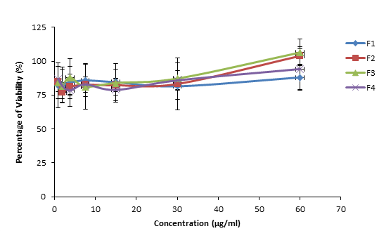 According to the result in Figure 2, all of the microemulsion formulations were defines as non-toxic against HIG-82 cell line. The HIG-82 have been selected in this study because it was extensively used as the test system for the prediction of toxicity, inflammatory and this cell line is also suitable for transfection host.17 Regarding to the obtained results, it was found that the IC50 of the samples is not less than 30µg/ml and even we were used the highest concentration, there are still live cells as well.