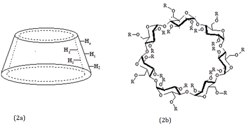 Figure 2 (A) Schematic representation of the truncated cone structure of the CDs. (b): HPβCD (R = CH2CHOHCH3)