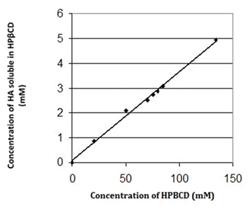 The stoichiometry of HA/HPβCD complex in solution was determined by the solubility technique. According to Higuchi and Connors’s theory,13 if the saturation concentration of HA versus the concentration of HPβCD in solutions yield a linear relationship this may be attributed to the formation of a 1:1 inclusion complex between HA and HPβCD.8