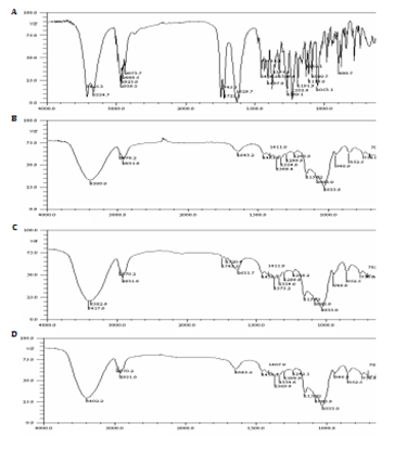 Fourier transform infrared spectroscopy analysis: FT-IR is a useful technique used to confirm the formation of an inclusion complex.8 The FT-IR spectra of HA (A), HPβCD (B), physical mixture and (C) and inclusion complex (D) are presented in the Figure 4. The FT-IR spectrum of HA showed bands features of HA at 3425, 3cm-1 and 3334,7cm-1, both for O-H stretching vibrations from the hydroxyl groups of the secondary and tertiary alcohols. The bands presented in the region between 3000cm-1 and 2850cm-1 are attributed stretching vibrations from the many types of bonds C-H. At 1745,5cm-1, 1722,3cm-1 and 1629,7cm-1 the bands are stretching vibrations of bonds C=O from carbonyl of acetate, ketone α-hidroxylated and ketone α, β-unsaturated, respectively. At 1232,4cm-1 is corresponding to stretching vibrations of bonds C-O from acetate. The FT-IR spectrum of HPβCD showed bands features at 3386,8cm-1 that may be assign to stretching vibrations of bonds O-H, at 2970,2cm-1 and 2931,6cm-1 due to stretching vibrations of bonds C-H, at 1643,2cm-1 this is referring to the aldehyde carbonyl group of possible open CD units.