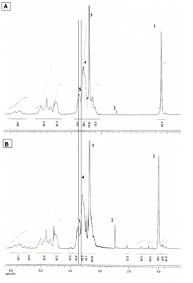 Figure 5 1H-NMR spectra in DMSO-d 6 (solvent) of HPβCD (A) and the freeze-dried HA/HPβCD inclusion complex (B). The numbers 1-5 indicate the signals for the hydrogen atoms of the methyl groups of HPβCD (1), solvent (2), water of solvent (3), H-5 from HPβCD (4), H-3 and H -6 from HPβCD (5).