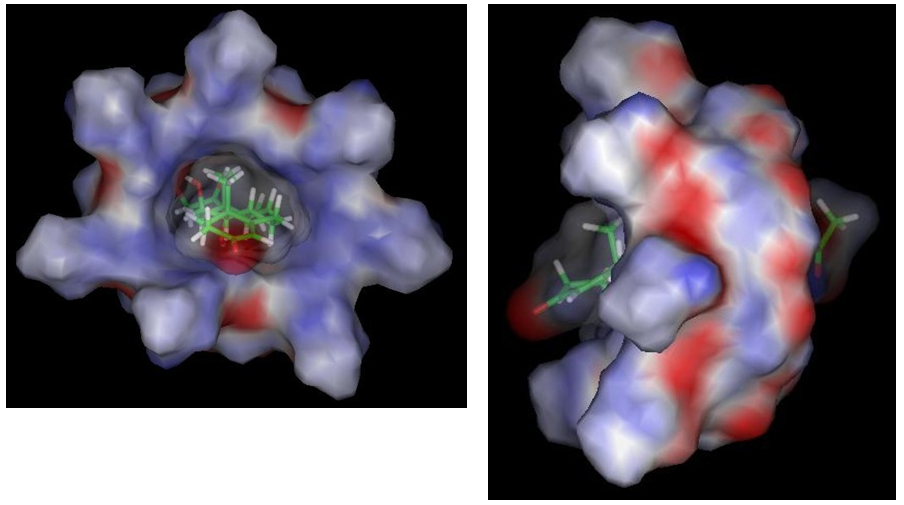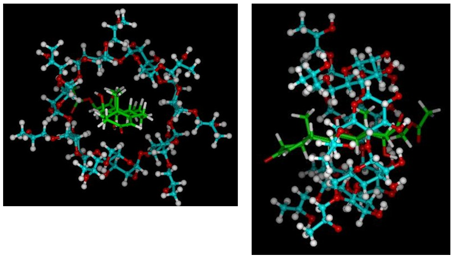 The Figure 7 (frontal and lateral view) again shows the inclusion complex model in opaque van der Waals solid surface visualization mode HP βCD and transparent HA, where it is possible to visualize that the HA completely fills the cavity diameter of the HPβCD (front view), and the part of the HA molecule that is included, corresponds to rings B, C and D and which is not fully included, corresponds to the carbonyl groups of ring A and acyl acetate (lateral vision), which are located precisely at the ends of the molecule.