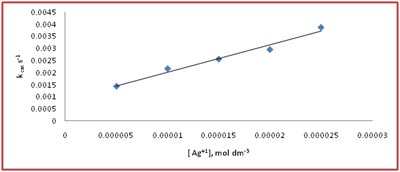 The dependence of Ag(I) on the reaction rate was studied by varying Ag (I) from 5x10-6mol dm-3 to 2.5x10-5moldm-3at S(IV) = 2x10-3mol dm-3 pH= 4.95, t= 30°C in acetate buffer medium. The values of First order rate constant kcat for S(IV) oxidation was determine are shown in Figure 2. The nature of dependence of kcat on Ag (I) was indicated as two term rate law (6).