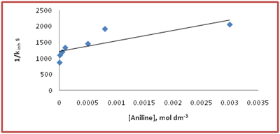 Figure 5 Effect of aniline at [S(IV)] = 2x10-3 mol dm-3, Ag (I) = 5x10-6 mol dm-3, pH = 4.95, t = 30°C in acetate buffered medium. The plot of 1/ Kinh v/s [Aniline] is linear with intercept 1.21 x 103s and slope 3.25x105 mol dm-3 s from which the value of B = 0.26 x103 mol dm-3.
