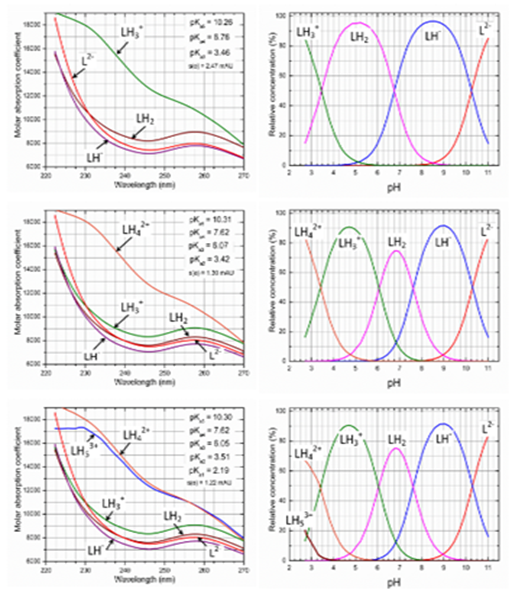 The strategy for efficient experimentation in dissociation constants determination followed by spectral data treatment was used according to the published Tutorial.16 A qualitative interpretation of the spectra aims to evaluate the quality of the data set, remove spurious data, and estimate the minimum number of factors, that is contributing aqueous species, which are necessary to describe the experimental data.