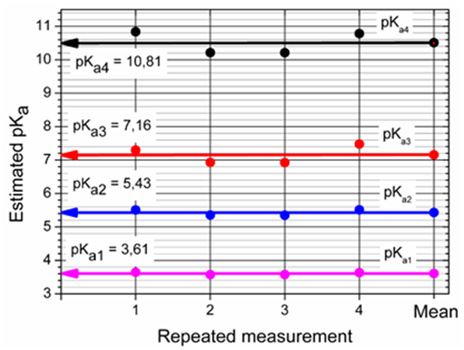 Figure 5 Reproducibility of found four dissociation constants pKa1, pKa2, pKa3, pKa4 with the regression analysis of pH-absorbance matrix of 5.8×·10-5M Ibrutinib at I=0.004 at 25°C with SQUAD84 and REACTLAB.