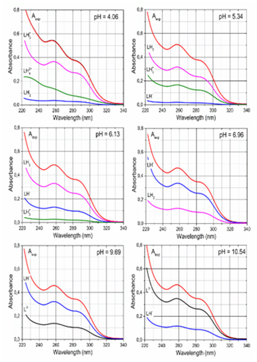 Figure 6 presents six following figures from pH=4.06 through pH=10.54 to show the consecutive deprotonation response in spectra, when each spectrum was decomposed into the spectrum of differently protonated species in a mixture of Ibrutinib. At pH = 4.06 the cation LH3+ accompanying cation LH42+ predominates in the solution. At pH=5.34 together with the neutral molecule LH2 one species LH3+ exhibits absorption band at the same of the absorption maximum λmax. At pH = 6.13 and 6.96 the experimental spectrum is decomposed to two absorption bands concerning the neutral molecule LH2 which dissociates to anion LH-. At pH=9.69 the anion LH- occurs with anions LH2- and L2-, and concentration of L2- in the solution increases up to pH=10.54.