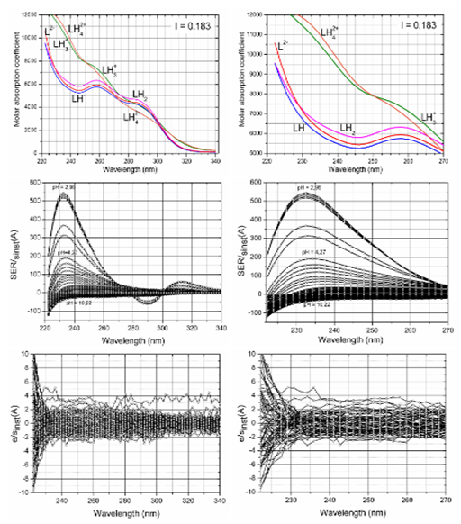 Figure 7 Plot of small absorbance changes in the Ibrutinib spectrum within pH-titration. Left panel: Spectrum range 220-340 nm. Right panel: Spectrum range 220-270nm. Upper row: The plot of molar absorption coefficient of variously protonated species vs. wavelength λ (nm). Middle row: The value of the absorbance difference for the jth-wavelength of the ith-spectrum Δij=Aij–Ai,acid is divided by the instrumental standard deviation sinst(A), and the resulting ratios SER/sinst(A) are plotted in dependence of wavelength λ for all absorbance matrix elements, where Ai,acid is the limiting spectrum of the acid form of the drug. Lower row: Plot of the ratio e/sinst(A), i.e. the ratio of the residuals divided by the instrumental standard deviation sinst(A) versus the wavelength λ for all the residual matrix elements for Ibrutinib tests if the residuals are of the same magnitude as the instrumental noise, Conditions: the same as in Figure 2, (SQUAD84).