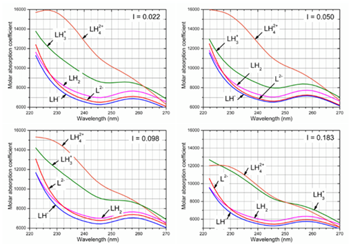 Determination of the thermodynamic dissociation constants: Examining the effect of the ionic strength on protonation of chromophore it is obvious from the dependence of the spectra shape on the ionic strength that at a low value of ionic strength the chromophore of three species LH2, LH- and L2- is not significantly affected by the change of pH (Figure 8). Two cations LH3+ and LH42+ differ in spectra in pure water but with increasing ionic strength the difference between ɛLH3 and ɛLH4 decreases and for ionic strength I=0.2 both spectra are nearly the same (Figure 8).