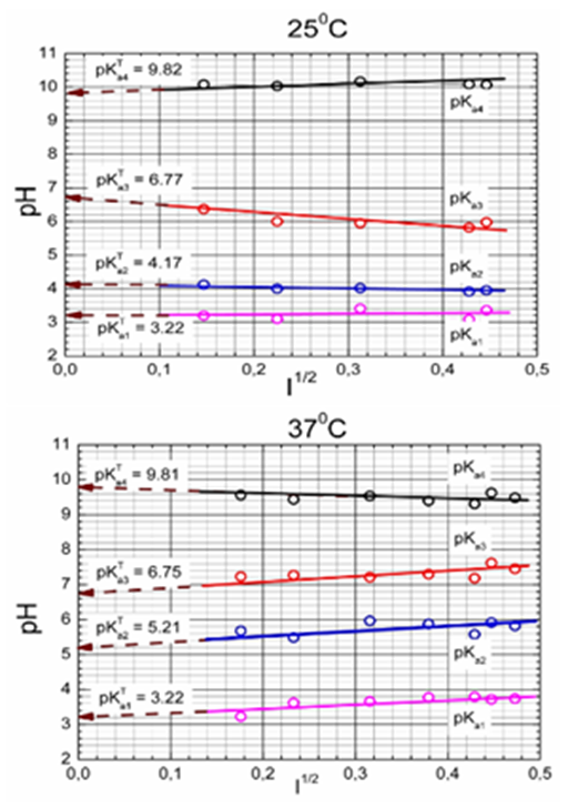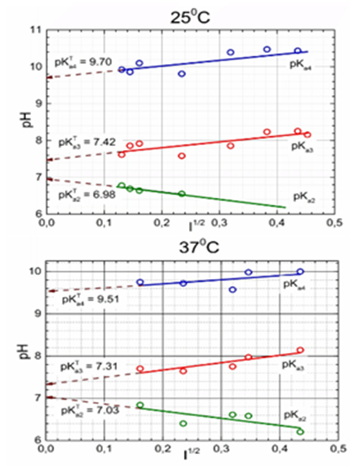 Figure 11 Dependence of the mixed dissociation constants of Ibrutinib on the square root of ionic strength for three dissociation constants leading to the thermodynamic dissociation constant pKaT at 25°C and 37°C.
