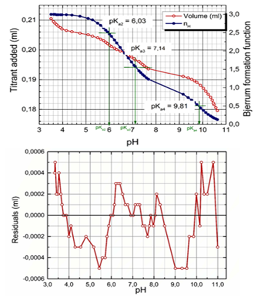 Conditions: Common parameters refined: pKa2=6.03, s2=0.03, pKa3=7.14, s3=0.04, pKa4=9.81, s4=0.07. Group parameters refined: L0=0.0003868mol. dm-3. Constants used: HT=-0.8138 mol. dm-3, t=25.0oC, pKw=13.9799, V0=20.22mL, s(V)=sinst(y)=0.0001mL, s(pH)=sinst(y)=0.01, I0=0.004 (in vessel), IT=0.8138 (in burette KOH) or 1.0442 (in burette HCl), (ESAB, ORIGIN).