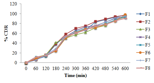 The in vitro dissolution studies of all eight formulations (F1 to F8) of TFGSM-based mucoadhesive microspheres of diclofenac sodium using a dissolution tester USP (Electrolab, TDT-08L), basket method in 900ml of pH 1.2 for 2h and pH 7.4 for 8 h at 37°C and 50rmp. At each time interval, 10ml of each formulation was taken and UV absorbance was recorded. The formulations exhibits a percentage cumulative drug release (CDR, %) in the range of 88.50% to 97.70% and was found that in formulations with decreasing ratio of TFGSM was higher. It was found that diclofenac sodium release from these microspheres in pH 1.2 was slow, less than 15.90% after 2h. This event might be due to shrinkage of alginate at acidic pH as alginate is known to be pH sensitive.23,24 In comparison, the drug release was observed to be more rapid in phosphate buffer, due to higher swelling rate of these microspheres in phosphate buffer. F6 showed the highest CDR (%) of 98.50%. The in vitro drug release of all formulations F1 to F8 is shown in Figure 1.