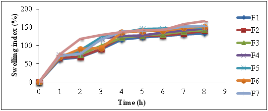 The swelling pattern of F1 to F8 ionotropically TFGSM-based mucoadhesive microspheres of diclofenac sodium were evaluated in 0.1 N HCl and phosphate buffer. The swelling patterns of these microspheres in both medium were shown in Figure 2 & Figure 3. It was observed that as the polymer concentration increases, the microspheres swells more. Initially, the extent of swelling of these TFGSM-based mucoadhesive microspheres of diclofenac sodium was lower in acidic medium compared with that of in phosphate buffer. This resulted due to shrinkage of alginate in acidic pH.23 Maximum swelling of the microspheres was observed at 2-3h in phosphate buffer and followed by erosion and dissolution. It was reported that phosphate ions present in the phosphate buffer can behave as calcium sequestrants, allowing further swelling of calcium alginate microspheres. This swelling pattern of TFGSM-based mucoadhesive microspheres of diclofenac sodium in phosphate buffer resulted by the exchange of ions between calcium ions present in phosphate buffer with the influence of calcium sequestrant phosphate ions. This phenomenon might result in disaggregation of the TFGSM and alginate matrix structure resulting in matrix erosion and dissolution of the swollen microspheres.26,27 These indicates that these TFGSM-based mucoadhesive microspheres of diclofenac sodium may show slight swelling in the stomach as they subsequently move to upper intestine, where the diclofenac sodium is to be absorbed, and these microspheres continue to swell more.