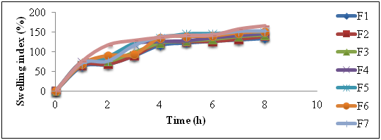 The swelling behaviour of the TFGSM-based mucoadhesive microspheres of diclofenac sodium was evaluated by swelling index test.15 Swelling index test of TFGSM-based mucoadhesive microspheres of diclofenac sodium was performed in 0.1N HCl (pH 1.2) and phosphate buffer (pH 7.4) aqueous mediums. 100mg of microspheres was placed in the beaker of dissolution apparatus containing 500ml of respective media. The experiment was carried out at 37±1°C under 50rpm paddle speed. The swelled microspheres was removed at predetermined time interval and weighed after drying the surface by using tissue paper.