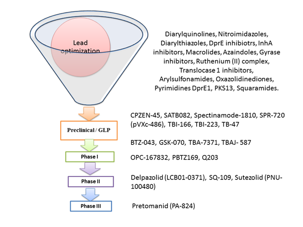Although decades of worship bring a light of new chemical classes and moieties for the treatment of tuberculosis and still running to enlighten more possible ways to withstand and draw a full stop to the condition, the standard reports of tuberculosis enlisting cases are still on the increment side rather to declining state. Since 90s the regimen of anti-TB drugs is well established but now it is under red alters concern as the drugs are resistant to the causative bacilli, M. tuberculosis, endangering mostly the developing countries and disease prone areas of the world. With the motivation of new drug approved for the disease, the moieties in the pipe line for the consideration of being a successful drug, the review also concerns about possible new classes for lead optimization process along with repurposed drugs trial.