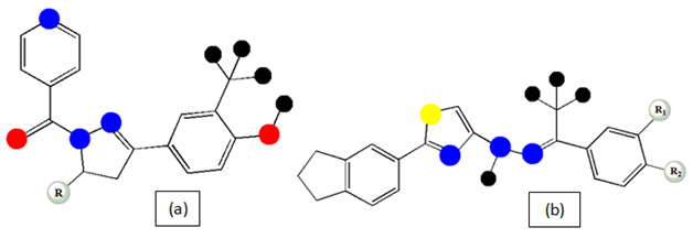Figure 4 Basic chemical structure of N1-nicotinoyl-3-(4’-hydroxy-3’-methyl phenyl)-5-[(sub) phenyl]-2-pyrazolines (a) and Thiazolylhydrazone derivatives (b).